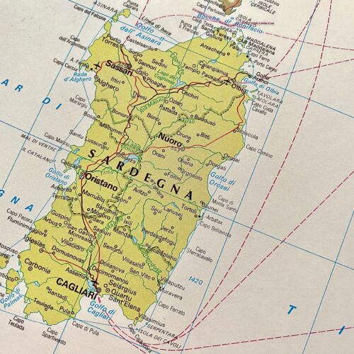 Von Nord nach Süd ist Sardinien 270km lang und von West nach Ost circa 145km breit. Die Landschaft ist meistens hügelig und der höchste Gipfel, Punta la Marmora, liegt mit 1834m Höhe im Gebirge des Gennargentu. Die Insel, welche nur 12km durch eine Meerenge von Korsika getrennt ist, liegt ca. 180km vor der tunesischen und 120km vor der toskanischen Küste.